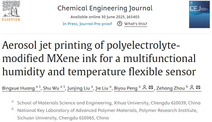 近日,材料科学与工程学院彭必友教授团队在材料科学与工程领域顶级期刊 《Chemical Engineering Journal》(IF=13.2)上发表题为“Aerosol jet printing of polyelectrolyte-modified MXene ink for a multifunctional humidity and temperature flexible sensor”的研究论文。彭必友教授与四川大学周泽航副研究员担任本论文的共同通讯作者,西华大学材料科学与工程学院青年教师黄冰雪博士及2023级硕士研究生吴戍为该论文的共同一作,西华大学为第一完成单位,四川大学为第二完成单位。该项研究得到了北京化工大学有机-无机复合材料国家重点实验室(oic-202401013)开放基金、广西碳酸钙资源综合利用重点实验室开放项目[批准号:HZXYKFKT202306]的资助。