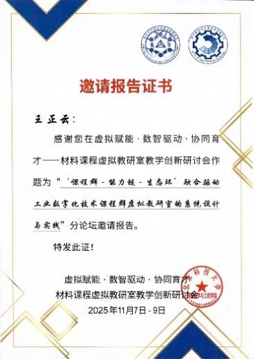 会议开幕式后,16位特邀嘉宾作了主题报告,内容涵盖AI赋能课程建设、知识图谱构建、课程思政融合、实验教学创新、教材与资源共建、虚拟教研室平台优化等前沿热点。王正云副院长受邀在“数智驱动·课程建设”主题会场上作了“课程群-能力链-生态环融合驱动——工业数字化技术课程群虚拟教研室的系统设计与实践”的专题报告。