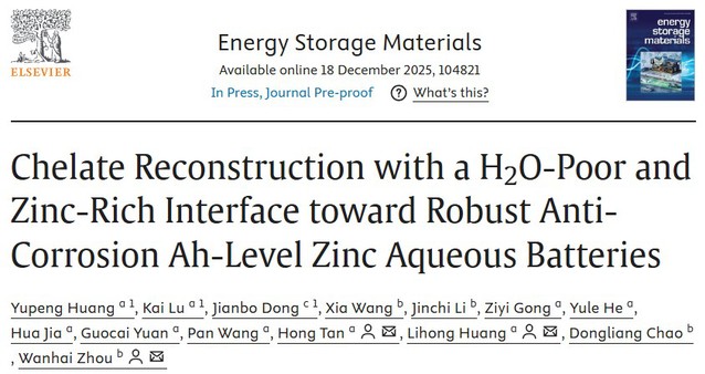 近日,材料科学与工程学院黄丽宏教授团队与复旦大学晁栋梁/周万海团队合作,在国际顶尖期刊《Energy Storage Materials》上发表题为“Chelate Reconstruction with a H2O-Poor and Zinc-Rich Interface toward Robust Anti-Corrosion Ah-Level Zinc Aqueous Batteries”的研究论文。《Energy Storage Materials》2025年最新影响因子为20.2 ,是材料与化学领域的公认顶级期刊(中科院大类/小类一区Top期刊),同时被国际权威的自然指数评选为顶级期刊之一。西华大学黄丽宏教授、青年博士谭鸿和复旦大学周万海教授为论文共同通讯作者,西华大学硕士研究生黄玉鹏、芦凯为论文的共同第一作者,西华大学为第一完成单位。