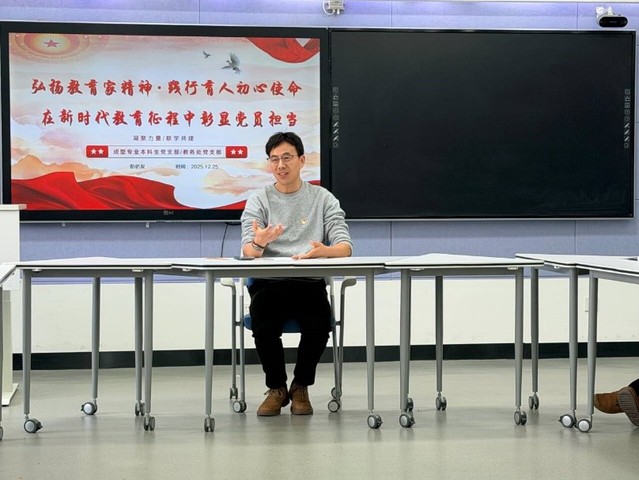 为进一步弘扬教育家精神,强化师生党支部交流共建,12月25日,学院材料成型及控制工程专业本科生党支部与教务处党支部在5B512智慧教室联合开展“弘扬教育家精神·践行育人初心使命,在新时代教育征程中彰显党员担当”主题党课活动。活动由教务处党支部书记彭必友主持,双方支部全体党员参与。