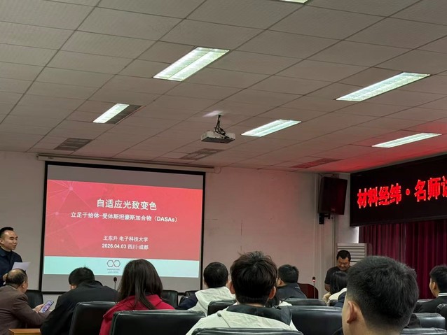 2026年4月3日上午,电子科技大学副教授王东升博士应邀到参加“材料经纬・名师讲堂”活动,在5A-427作题为“自适应光致变色”的专题学术报告。本次报告由材料科学与工程学院主办,韩锐院长主持,学院百余名师生到场聆听学习。